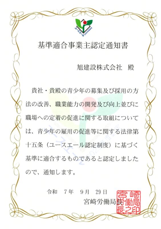 このたび旭建設株式会社は、厚生労働省より「ユースエール認定企業」として認定をいただきました。