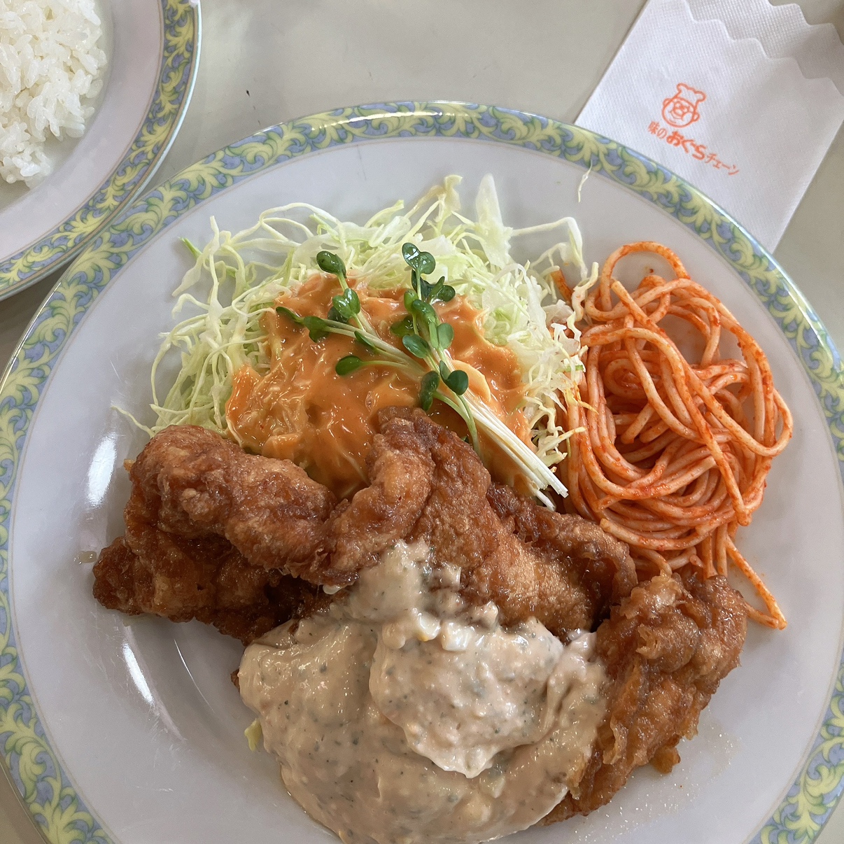 友人も大きな一枚の鶏肉にたっぷりのタルタルソースがかかったチキン南蛮に驚き、おいしそうに食べていました。